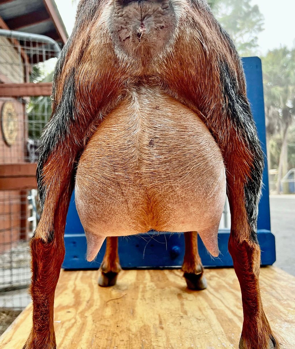Scooby is one of our stunners here at the Looney Bin. Not only is her coloring very unique and amazing with her rusty buckskin tones and beautiful frosted roaning, she is absolutely the friendliest goat in our little herd. We are happy to have her here and very proud of her Kidco and amazing extensive Dills' lines out of Oklahoma.